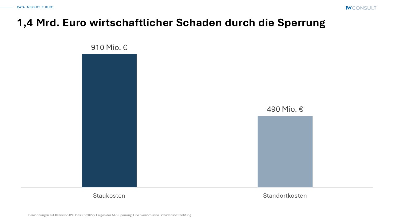 Seit der Sperrung der Rahmedetalbrücke ist jedes Jahr ein wirtschaftlicher Schaden von rund 360 Mio. Euro entstanden. Das Institut der deutschen Wirtschaft (IW) hat vor wenigen Wochen seine eigene Prognose aus dem Jahr 2022 noch einmal überprüft. „Unsere damalige Prognose war sehr konservativ gerechnet, sodass wir einen Gesamtschaden von mindestens 1,4. Mrd. Euro bis zum heutigen Tag bestätigen können“, erläutert Hanno Kempermann, Geschäftsführer des Instituts der deutschen Wirtschaft Köln Consult GmbH. Die Abhängigkeit der gesamten Region von der A 45 ist außergewöhnlich hoch und erklärt die überproportional hohen volkswirtschaftlichen Schäden“, erläutert Kempermann. „Aus volkswirtschaftlicher Sicht ist eine integrierte Planung von Brücken, Autobahnkreuzen und Fahrbahnen auf der A 45 ein sinnvoller